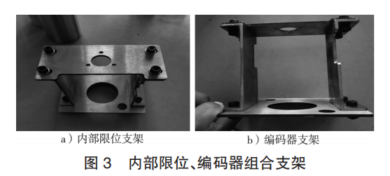 為了滿足在緊湊的環(huán)鏈葫蘆殼體內(nèi)部加裝機(jī)械限位開關(guān)、編碼器的需求,需要根據(jù) ABUS 環(huán)鏈葫蘆自帶原裝限位開關(guān)的外觀尺寸以及編碼器的安裝尺寸來設(shè)計(jì)加工固定支架。支架部件間采用可調(diào)節(jié)連接方式,立支架兩側(cè)開挖空檔,便于人工手動調(diào)整限位開關(guān)。內(nèi)部限位、編碼器組合支架如圖 3 所示。