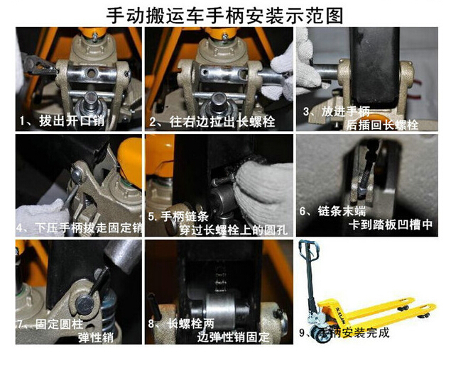 目前,越來越多的場(chǎng)所都會(huì)看到手動(dòng)搬運(yùn)車的身影,重量輕,容易操作,價(jià)格低,又經(jīng)濟(jì)實(shí)用。特別適用于汽車裝卸及車間、倉庫、碼頭、車站、貨場(chǎng)等地的易燃、易爆和禁火物品的裝卸運(yùn)輸設(shè)備。下面北京凌鷹技術(shù)人員來教你地牛手柄的安裝,詳情如下: