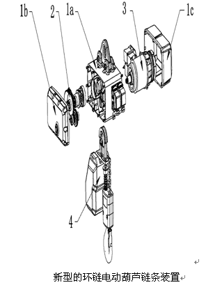 環(huán)鏈電動葫蘆主要由減速器,電機以及鏈條組成,但是由于對減速器,電機以及鏈條的布局不合理,導(dǎo)致環(huán)鏈電動葫蘆的體積較大,同時環(huán)鏈電動葫蘆的零部件數(shù)量很多,由于其零部件多為非標零件,生產(chǎn)這些零件還需要定制很多的模具,這就不利于零部件的生產(chǎn)管理,也不利于環(huán)鏈電動葫蘆生產(chǎn)過程中風(fēng)險的控制,而且現(xiàn)有技術(shù)中沒有針對繞于鏈輪上的鏈條進行很好的保護,往往在上升過程中容易脫鏈,導(dǎo)致環(huán)鏈電動葫蘆的安全性低。