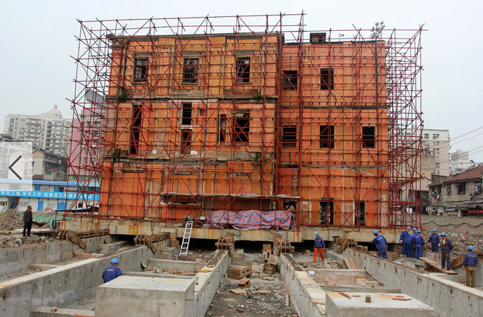 據(jù)了解,建筑物年代久遠(yuǎn),為了保證移動(dòng)時(shí)不散架,必須要求基礎(chǔ)的加固工程做得更細(xì)致。水泥托盤(pán)是在房屋地基被掏空后,用液壓千斤頂將小樓抬高1.4米,用鋼筋混凝土澆筑而成。這樣,平移時(shí)的受力點(diǎn)也都在“托盤(pán)”上,而不在樓體建筑上。經(jīng)過(guò)反復(fù)推算,后將平移速度設(shè)置在每小時(shí)70厘米。