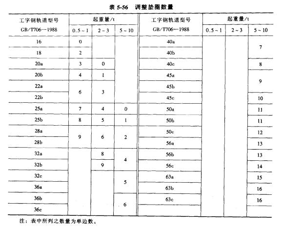 3、由于廠房跨度大小不一,選用工字梁軌道大小不同,因此走輪組件在安裝時應(yīng)隨工字梁軌道的寬度,用調(diào)整墊圈進(jìn)行調(diào)整(見圖5.48),調(diào)整墊圈數(shù)量如表5.56所示。