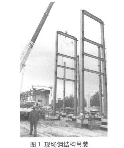 吊車選擇:現(xiàn)場鋼結構吊裝時,成片鋼結構常采用一機主吊、一機抬吊法進行吊裝,立柱常采用單機旋轉法進行吊裝。由于成片鋼結構整體重量重于10t,高度在20m以上,吊點一般設置在頂部橫梁處,雙吊點吊裝。所以根據情況考慮負載、地面脫鉤,在吊裝過程中選用大噸位、長臂吊車。且吊索高度應與立柱或者鋼結構高度一致,吊車吊裝高度至少為鋼結構高度的一倍。