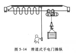 3、滑道式手電門操縱,如圖5-14所示。這種操縱方式可根據(jù)操作人員的實(shí)際需要,自由地掌握與吊載的遠(yuǎn)近,既安全又方便,是較好的地面操作方式之一。