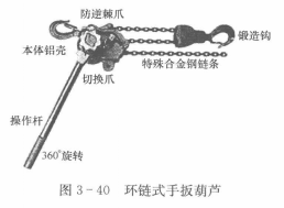1、環(huán)鏈?zhǔn)绞职夂J(見圖3-40)??堪鈩邮直?,通過傳動機(jī)構(gòu)帶動起重鏈條升降重物。環(huán)鏈?zhǔn)绞植话埠J是設(shè)備安裝,貨物起吊、物體固定、綁扎和牽引的理想工具,尤其是任意角度的牽引和在場地狹小,露天作業(yè)及無電源的情況下,更顯示其優(yōu)越性。