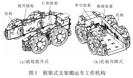 框架式支架搬運(yùn)車主要用來拖運(yùn)支架,如圖1所示,其工作機(jī)構(gòu)是基于U形框架的鏈輪提升式(或托板升降式)支架裝載機(jī)構(gòu)。鏈輪提升式機(jī)構(gòu)是利用4 個(gè)吊鉤鉤住支架起吊環(huán),通過操作提升鏈輪動(dòng)作實(shí)現(xiàn)支架的提升裝載。倘若U形框架內(nèi)寬設(shè)計(jì)較窄,待支架進(jìn)入框架時(shí),支架兩側(cè)剩余空間較小,增加了工人的掛鉤難度,影響了支架的裝卸速度;另外,倘若提升鏈輪的離地高度設(shè)計(jì)較高,待支架進(jìn)入框架時(shí),壞損支架的側(cè)護(hù)板處于張開狀態(tài),張開的側(cè)護(hù)板極易與提升鏈輪發(fā)生碰撞,阻礙支架進(jìn)入框架,同樣影響了支架的裝載速度。托板升降式機(jī)構(gòu)的裝卸架原理是在裝架時(shí)落下托板,利用牽引裝置將支架牽引至框架內(nèi),卸架時(shí)利用推移裝置將支架推出框架,以此實(shí)現(xiàn)支架的裝卸。倘若在使用過程中,托板滾輪卡滯,加之牽引裝置繩力設(shè)計(jì)有限,則會(huì)導(dǎo)致裝架困難;倘若推移裝置推出時(shí),其導(dǎo)向套筒發(fā)生變形別卡,則會(huì)導(dǎo)致卸架困難,進(jìn)而影響了支架搬運(yùn)車的作業(yè)效率。
