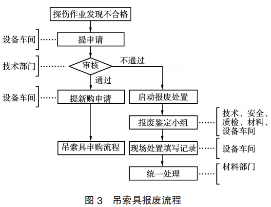 當(dāng)探傷發(fā)現(xiàn)有不合格吊索具時,由設(shè)備車間提報報廢申請,報技術(shù)部門審核,通過后設(shè)備車間組織報廢鑒定小組進(jìn)行現(xiàn)場處置并填寫臺賬記錄,同時由材料部門處置并新購。