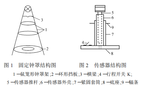傳感器外殼固定在套筒上,底座則與套筒固定在一起、三者連為一體。設(shè)置環(huán)形擋板和輻條是因為在電動葫蘆制動后,底座和重物砣由于受到自身重力的作用,必然要下滑一段距離,當?shù)鬃禄絺鞲衅魍茥U端部時,輻條碰住環(huán)形擋板上表面,底座停止下滑,這樣可避免將推桿從傳感器外殼中拉出。同時,環(huán)形擋板還起著在底座上升時閉合行程開關(guān)的作用。因此,環(huán)形擋板和輻條的安放位置十分關(guān)鍵。環(huán)形擋板的位置應(yīng)保證在測試過程中重物饦推動底座上升到行程開關(guān)碰住環(huán)形擋板底部時,傳感器端部與底座之間仍有一微小距離,這樣就防止了底座撞擊傳感器端部而損壞傳感器。輻條的位置應(yīng)保證底座下滑到碰到環(huán)形擋板時,推桿剛好到達傳感器大位置且未從外殼中拉出。