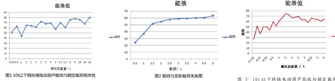 在對(duì)不同規(guī)格,不同型號(hào)的環(huán)鏈電動(dòng)葫蘆的能效值進(jìn)行對(duì)比的同時(shí),還收集了同1臺(tái)葫蘆在從輕載到額載工況下,能效隨試驗(yàn)載荷變化而變化的試驗(yàn)數(shù)據(jù)。經(jīng)過(guò)對(duì)數(shù)據(jù)的分析,圖2列舉了一臺(tái)5t的雙速環(huán)鏈電動(dòng)葫蘆能效隨載荷變化的變化曲線,此曲線具有廣泛代表性。根據(jù)曲線趨勢(shì),可得出以下結(jié)論,鋼絲繩電動(dòng)葫蘆在吊載不足30%額定起重量的載荷時(shí),其能效值很低,大量能量均被浪費(fèi),當(dāng)?shù)踺d重物超過(guò)30%額定起重量的載荷時(shí),電動(dòng)葫蘆的能效值會(huì)有顯著提升,并逐漸趨于高能效值,直至吊載重物超過(guò)50%額定起重量,能效值變化非常微小,趨于穩(wěn)定。