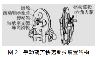 手拉葫蘆快速助拉裝置可以固定手拉葫蘆的手拉鏈條,給手拉鏈條提供拉力以提升重物,驅(qū)動力可通過鏈輪外接電機,也 可以通過內(nèi)六角接頭外接氣動扳手。 該裝置由鏈輪、滾動軸承組件、傳動軸、軸承座支架、導(dǎo)向滑輪、驅(qū)動鏈輪和外六角方驅(qū)組成(圖 2)。