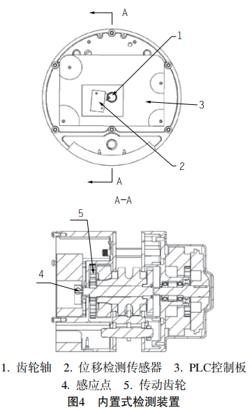 內(nèi)置式高度檢測裝置如圖4所示,它主要由齒輪軸、位移檢測傳感器和PLC控制板組成。齒輪軸位于電動葫蘆內(nèi),齒輪軸貫穿PLC控制板,PLC控制板上設有位移檢測傳感器,位移檢測傳感器位于齒輪軸旁,PLC控制板與位移檢測傳感器電連接,齒輪軸上設有感應點,感應點與位移檢測傳感器配合。根據(jù)不同葫蘆的結構,在葫蘆電機的齒輪軸上,布置一個凸起或凹陷的感應開關感應點用于檢測該軸的轉動圈數(shù)。電動葫蘆必須配置控制的PLC或單片機,用于處理感應開關檢測到軸的轉動圈數(shù)。每臺環(huán)鏈電動葫蘆會根據(jù)實際鏈條長度,預先在程序中設定好鏈條的首位限位點。PLC或單片機程序設定好檢測的軸與起重鏈條運行距離的比例,再根據(jù)檢測軸轉動的圈數(shù)計算出鏈條運行的距離,實時計算出吊鉤的高度,當鏈條運行到限位點時會自動停機,起到限位的作用。