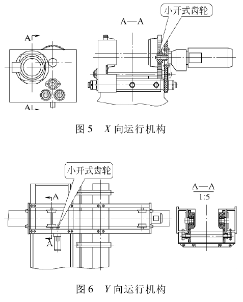 X、Y運(yùn)行機(jī)構(gòu)采用H型鋼運(yùn)行軌道,為解決輪壓分布不均勻,易打滑的現(xiàn)象,車(chē)輪采用小開(kāi)式齒輪—+同步開(kāi)式齒輪裝置傳動(dòng)的形式,運(yùn)行機(jī)構(gòu)采用三合一減速電動(dòng)機(jī),結(jié)構(gòu)簡(jiǎn)單,運(yùn)行平穩(wěn),安全可靠。X、Y運(yùn)行機(jī)構(gòu)見(jiàn)圖5和圖6。