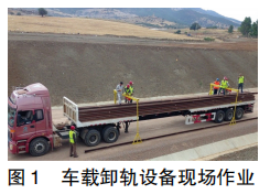 從設(shè)備的耐用性出發(fā),設(shè)備需要結(jié)構(gòu)簡單,操作簡單,維修方便,制作維護成本低,從設(shè)備的安全性出發(fā),設(shè)備需要滿足長途運輸過程中自身不脫落車體,并且滿足在裝卸鋼軌過程中的承重能力達到要求,從設(shè)備的快速機動性出發(fā),起重裝置需采用電力驅(qū)動,以提升起重升降的效率。另外設(shè)備的運行狀態(tài)需 要針對鋼軌運輸過程中的各種狀態(tài)快速切換,如在基 地裝車鋼軌時不能影響大型龍門吊作業(yè),運至現(xiàn)場后 快速切換至卸軌作業(yè)狀態(tài),作業(yè)狀態(tài)中卸軌后行進至下一卸軌里程點的短程行進狀態(tài)與裝卸狀態(tài)能夠快速切換,根據(jù)上述需求,從實際情況出發(fā),項目所使用的運軌設(shè)備是兩臺國內(nèi)采購的可伸縮平板車,縮合狀態(tài)時長度為12m可用于運送軌枕,最大伸長狀態(tài)時長度為18m 用于運送鋼軌,則需要將卸軌設(shè)備與平板車結(jié)合起來。參照已有的大型龍門架,可以在平板車上設(shè)計一 個縮小版的門架式體系,平板車頂面兩側(cè)設(shè)有數(shù)個插槽,原本是為防止運輸中鋼軌脫落放置立柱使用,現(xiàn)可借助該立柱,輔以一根橫梁以及一根立于地面的支柱,形成一個門架式體系,門架式體系形成后,模仿基地裝卸鋼軌的大型龍門吊,在橫梁上安裝一個可以滑動的電動葫蘆,在車尾處安裝一臺發(fā)電機以提供動力。在鋼軌上選取兩個吊點設(shè)置兩組門架體系,使用裝在橫梁上電動葫蘆的夾具,即可成功達到裝卸鋼軌的目的,如圖1所示。