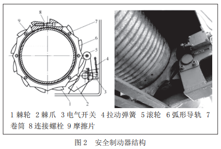 超速保護(hù)裝置中提到了安全制動(dòng)器,其結(jié)構(gòu)型式見圖2。標(biāo)準(zhǔn)規(guī)定當(dāng)起重機(jī)額定起重量大于5t時(shí),電動(dòng)葫蘆除設(shè)置一個(gè)工作制動(dòng)器外,還應(yīng)設(shè)置安全制動(dòng)器,且設(shè)置在電動(dòng)葫蘆的低速級(jí)上(當(dāng)起重機(jī)額定起重量小于或等于5t時(shí),也宜在低速級(jí)上設(shè)置安全制動(dòng)器,否則電動(dòng)葫蘆應(yīng)按1.5倍額定起重量設(shè)計(jì)),并要求在正常作業(yè)時(shí),安全制動(dòng)器應(yīng)在高速軸制動(dòng)器閉合后延時(shí)閉合,其延時(shí)動(dòng)作時(shí)間可調(diào),進(jìn)行緊急制動(dòng)時(shí),安全制動(dòng)器應(yīng)立即動(dòng)作。