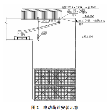在抽水蓄能電站地下廠房土建及機(jī)電設(shè)備安裝施工過程中,因施工場(chǎng)地空間受限,導(dǎo)致材料垂直運(yùn)輸通道單一影響現(xiàn)場(chǎng)施工進(jìn)度。為解決此類問題,利用電動(dòng)葫蘆具有體積小、自重輕、操作簡(jiǎn)單、使用方便等特點(diǎn),采用在副廠房頂拱巖體位置安裝電動(dòng)葫蘆、副廠房各樓層預(yù)留吊物孔的方式,形成副廠房臨時(shí)垂直運(yùn)輸通道,滿足土建施工期模板、腳手架。機(jī)電設(shè)備安裝期空壓機(jī)氣罐、電氣盤柜等材料設(shè)備的轉(zhuǎn)運(yùn),有效利用現(xiàn)場(chǎng)施工空間。從而達(dá)到提升施工效率、降低現(xiàn)場(chǎng)施工強(qiáng)度及節(jié)約施工成本的目的。