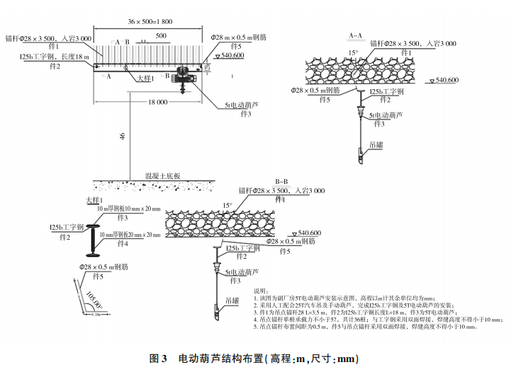 吊點(diǎn)錨桿施工:在通風(fēng)機(jī)房樁號(hào)CZO-122.00右6m至主廠房副廠房廠左12m段洞頂供高程540.600m位置布設(shè)一根125b工字鋼長(zhǎng)度18m 。5t電動(dòng)葫蘆通過125b