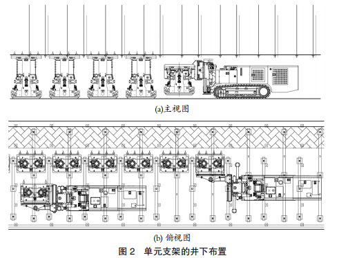 在沿空留巷工作面,單元支架通常布置在工作面后部,可以給脫模后墻體提供臨時(shí)保護(hù),能夠保證在墻體凝固到一定強(qiáng)度前不承接頂板壓力。為防止反復(fù)撐頂破壞頂板,單元支架的移動(dòng)采用無(wú)反復(fù)支撐的方式。撤除時(shí),采用專(zhuān)用搬運(yùn)車(chē)將最后面的支架移至最前面,保證留巷頂板完好。單元支架在井下工作面的布置如圖 2 所示。