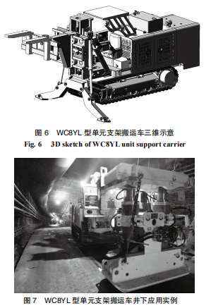 為提高單元支架的搬運(yùn)效率,聯(lián)合專(zhuān)業(yè)廠家研發(fā)了 WC8YL 型單元支架專(zhuān)用搬運(yùn)車(chē),并已在神東集團(tuán)錦界煤礦、新汶集團(tuán)內(nèi)蒙能源長(zhǎng)城三礦、陜西麟北煤業(yè)園子溝煤礦等多家煤業(yè)公司成功應(yīng)用。WC8YL 型單元支架搬運(yùn)車(chē)三維示意及井下應(yīng)用實(shí)例如圖 6、7 所示。