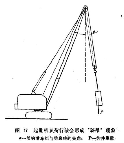 因?yàn)槠鹬貦C(jī)負(fù)衙行駛時(shí),由于道路不平或慣性原因,構(gòu)件總難免要發(fā)生擺動(dòng)而使起重機(jī)吊鉤滑車組離開垂直線位置,形成“斜吊”,如圖17所示。如果起重機(jī)吊著重量為P的構(gòu)件已是滿負(fù)荷。則當(dāng)梅件擺動(dòng)后,實(shí)際就是格負(fù)荷了。構(gòu)件擺動(dòng)的夾角a如過大,傾覆力矩增大,起重機(jī)就可能翻車。因此,起重機(jī)滿負(fù)荷時(shí)要盡量避免行駛。如需作短距離行駛,只熊將構(gòu)件吊離地面20—30厘米,且要慢行,還必須拉好溜繩,控制構(gòu)件擺動(dòng)。更多問題解答關(guān)注凌鷹電動(dòng)葫蘆專業(yè)廠家。