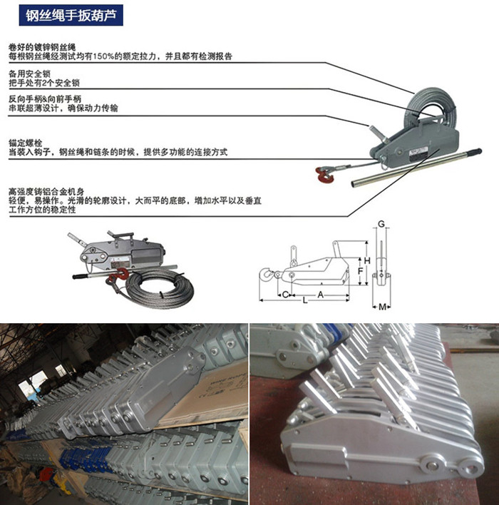 SM鋼絲繩手扳葫蘆機殼采用高強度優(yōu)質(zhì)鋁合金壓鑄而成,配套使用的鋼絲繩具有特別高的破斷拉力和耐磨性,根據(jù)客戶需要配置相適合的鋼絲繩長度。主要給個為800公斤、1600公斤、3200公斤。適用于工廠、礦山、建筑工地、碼頭、運輸?shù)雀鞣N場合,是設(shè)備安裝、貨物起吊、物體固定、綁扎和牽引的理想工具,尤其是任意角度的牽引和在場地狹小,露天作業(yè)和無電源的情況下,更顯示其優(yōu)越性。本產(chǎn)品嚴(yán)格按國家3包執(zhí)行,產(chǎn)品質(zhì)量由中國人民保險公司(PICC)承保,請放心使用。